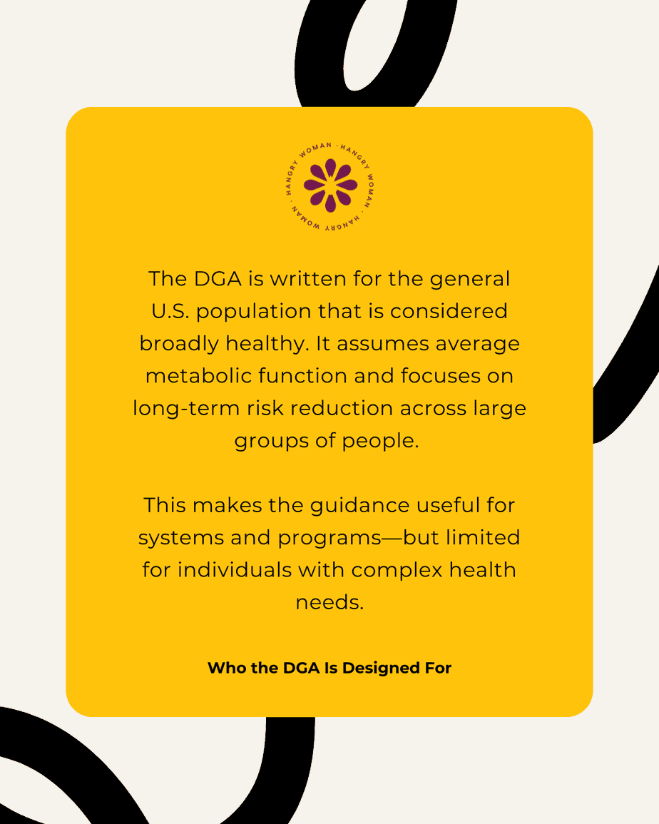 That means the DGA is written to support systems—like school meals, food assistance programs, and public health initiatives. It does not address individual health conditions.